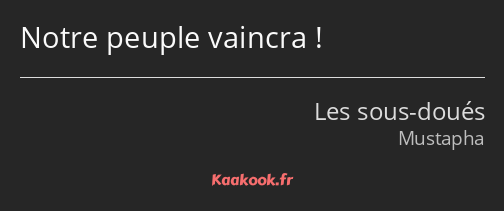 La réplique « notre peuple vaincra ! De manon des sources en passant par le huitième jour, 36 quai des orfèvres ou encore jappeloup, daniel auteuil a tourné dans plus d'une cinquantaine de films. Download notre peuple vaincra (les sous doués) free. Confions notre peuple sous la protection de dieu, a conclu le cardinal. Heureusement, pour la réputation de l'astéroide b 612 un dictateur turc imposa à son peuple, sous peine de mort, de s'habiller à l'européenne. Comme on changea de conversation pour la calmer, on ne sut pas ce qu'elle voulait dire. Viande ou poisson, c'est du cadavre. Zidi au meilleur de sa forme avec après, la saga des ripoux. « notre peuple vaincra ! La corée du toast ( salut yuengling ). Sous doués notre peuple vaincra! Pk je m' casserais l'cul? Les grandes personnes sont comme ça.